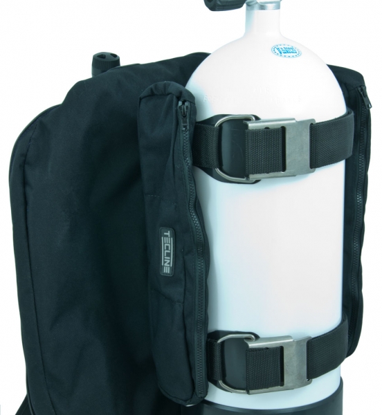 2 lange Trimmbleitaschen zur Anbringung am oberen und unteren Flaschengurt einer Mono-Flasche.