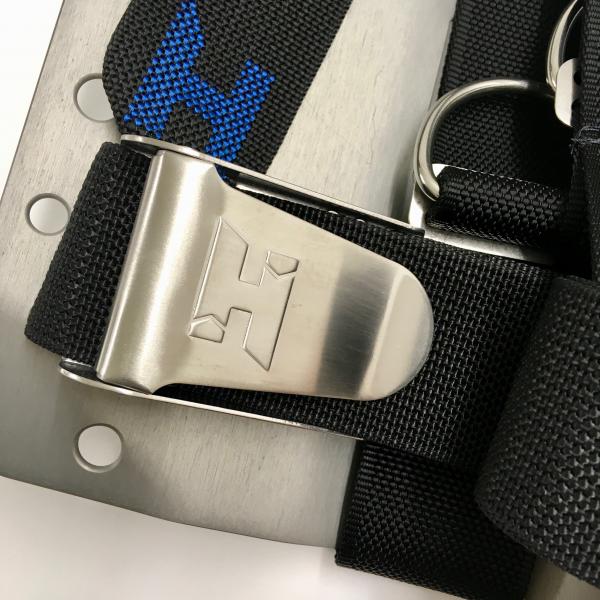 Die Backplate mit Harnes kommt vom Werk mit der blauen Halcyon-Logo Bebänderung.