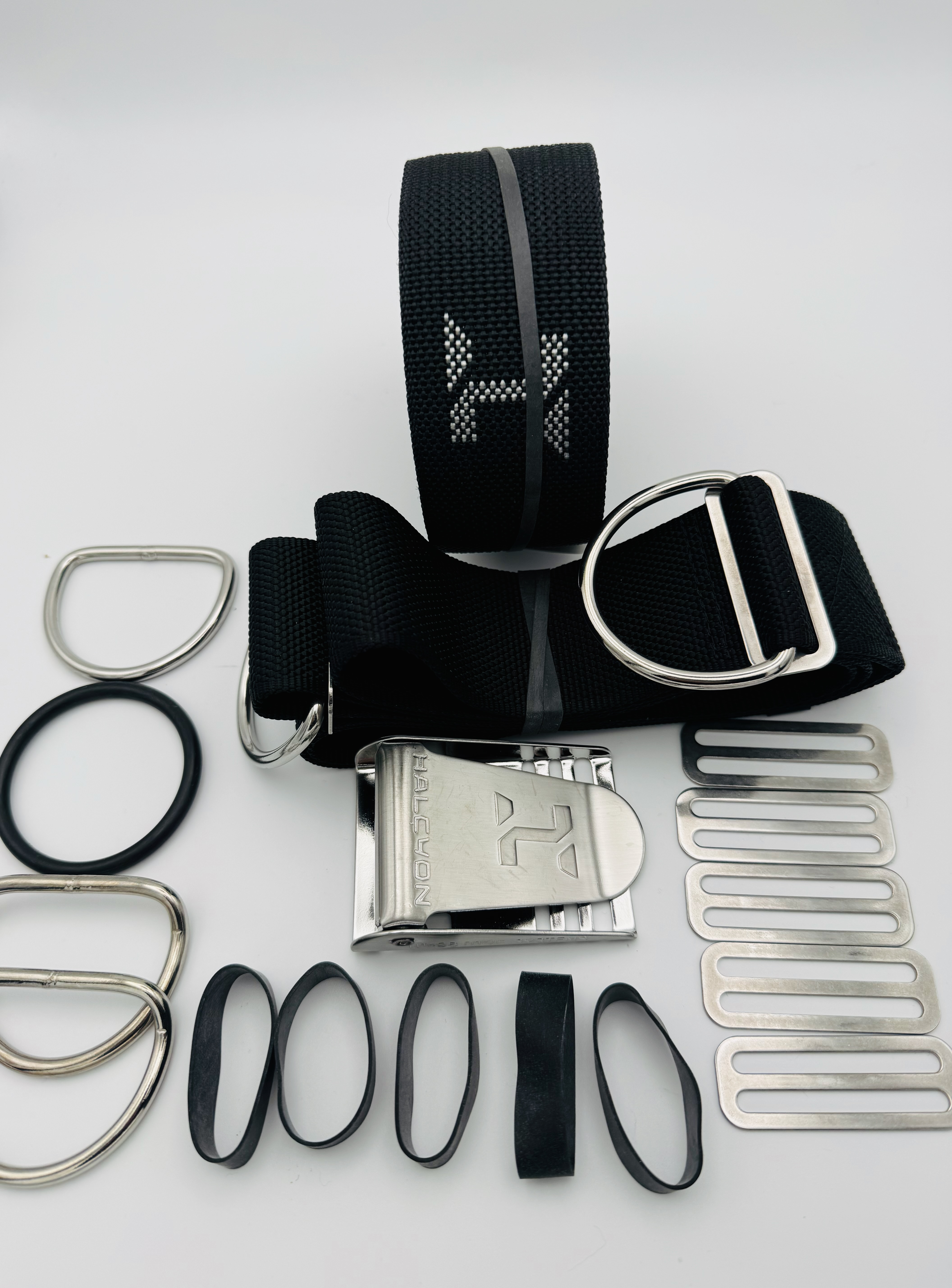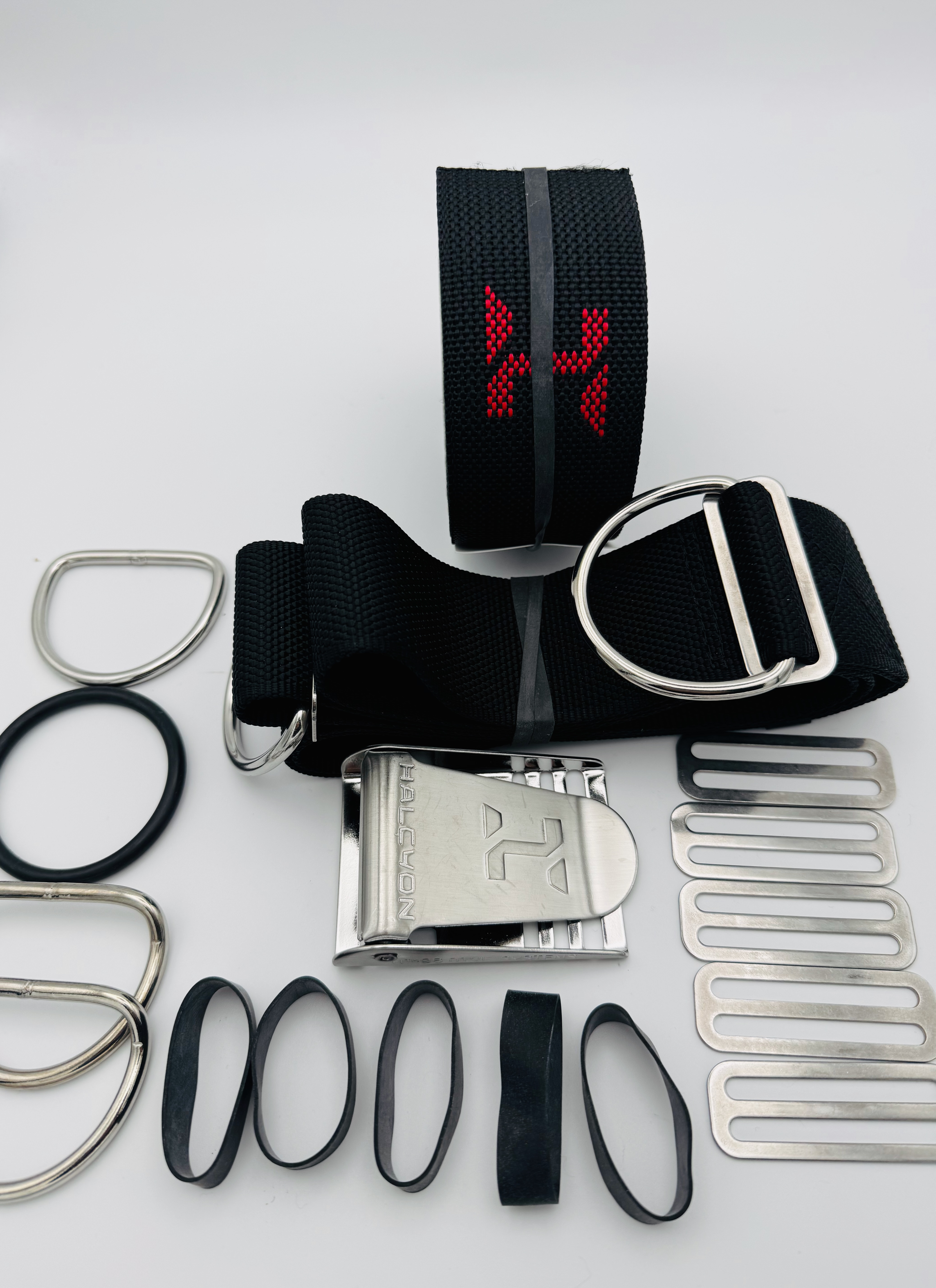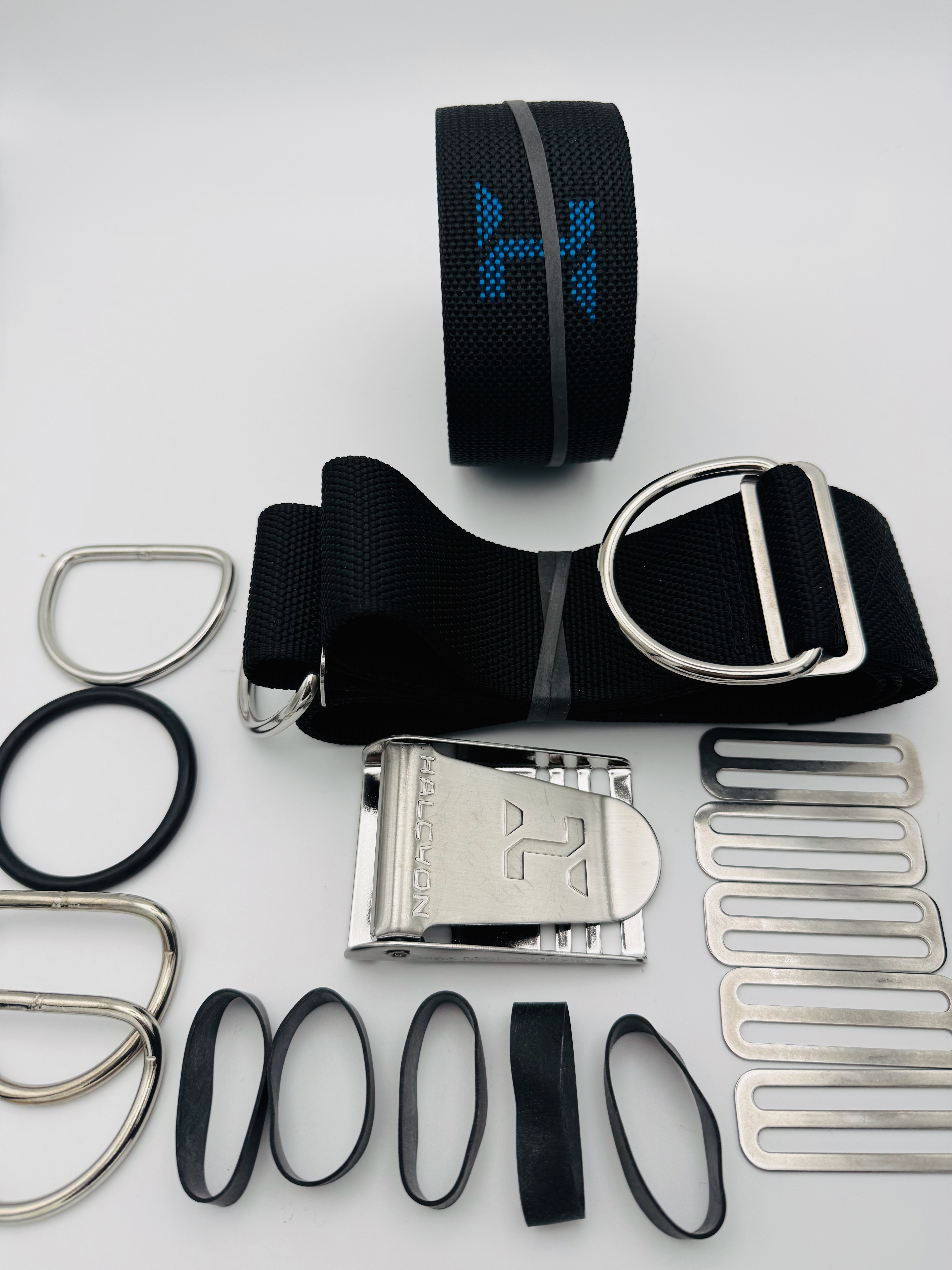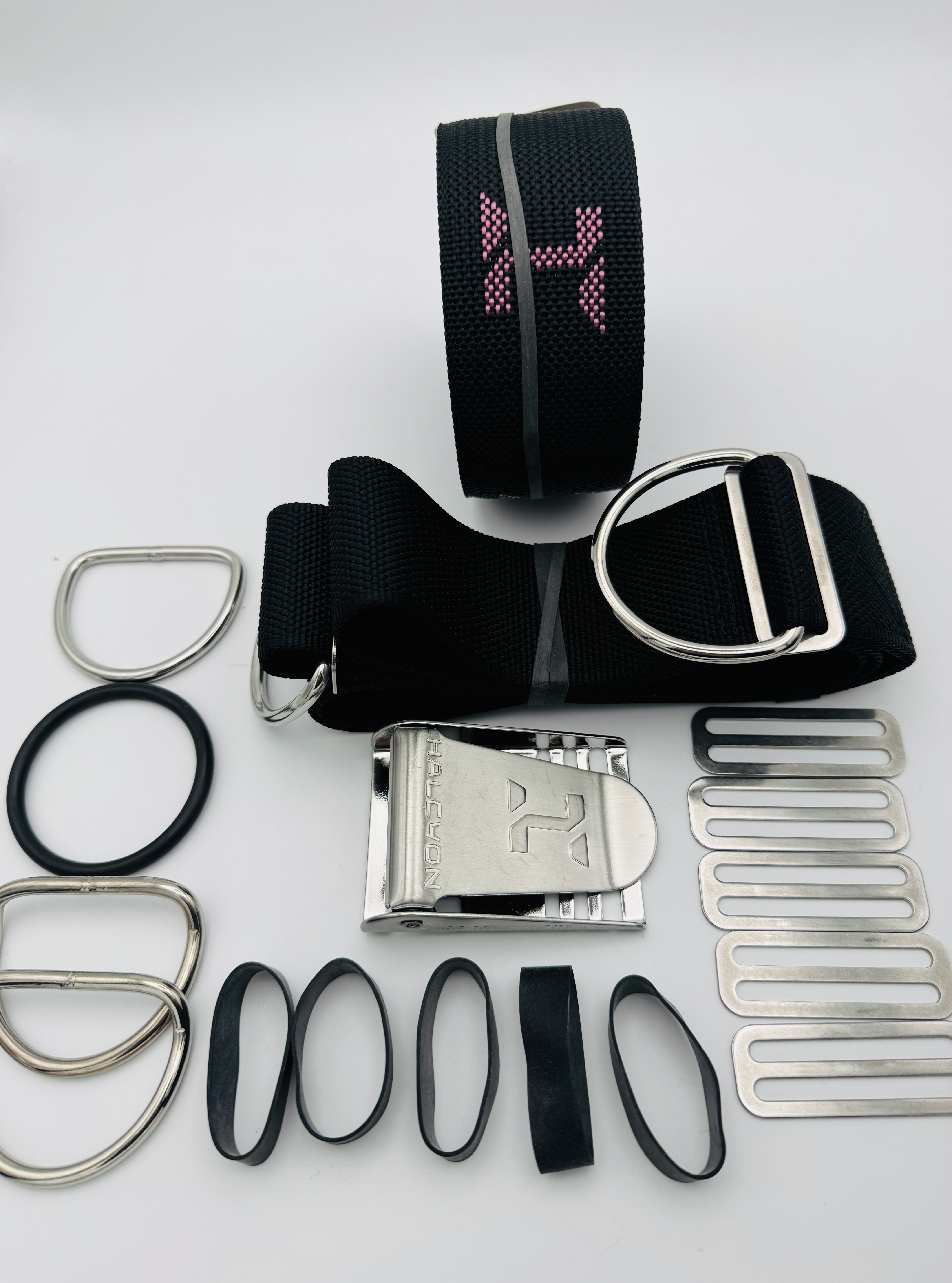 Halcyon Harness Komplett Set1 x "H" Gurtband in zwei Längen, Standard immer mit Öse oder in Small für die kurze Backplate (Farbwahl möglich)1 x Schrittgurt 1 x Gurtschnalle1 x großer O-Ring für Inflatorschlauch1 x glatter D-Ring2 x gekröpfte D-Ringe5 x Dreistege5 x HarnessgummisFolgende Farben zur Auswahl:"H" in Pink auf schwarzem Gurtband, "H" in Blau auf schwarzem Gurtband, "H" in Grau auf schwarzem Gurtband, "H" in Tropical (Aqua) auf schwarzem Gurtband,"H" in Schwarz auf graues Gurtband